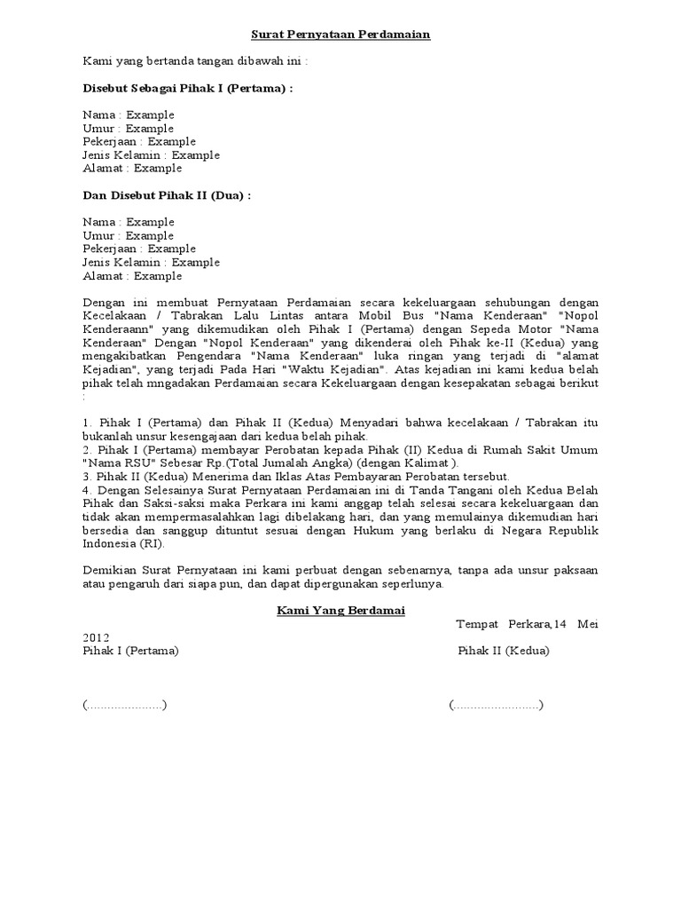 Simak 6+ surat perjanjian damai kecelakaan. SURAT PERJANJIAN DAMAI KECELAKAAN. Kumpulan Contoh Surat Pernyataan Damai Kecelakaan Terbaik 2019. Dalam suatu masalah yang seperti kejadian kecelakaan dijalan yang tidak kita sangka maka di saat kedua belah pihak tidak ingin melanjutkan ke dalam pengadilan alias damai dan diselesaikan secara kekeluargaan maka sebaiknya dibuat juga sebuah surat perjanjian damai agar tidak terjadi kesimpang siuran dan tuntutan dari. Simak juga tentangdamai dan surat perjanjian damai kecelakaan Contoh surat perjanjian damai kecelakaan lalu lintas doc setiap orang pastinya pernah melalui jalan raya untuk mobilitas sehari harinya.